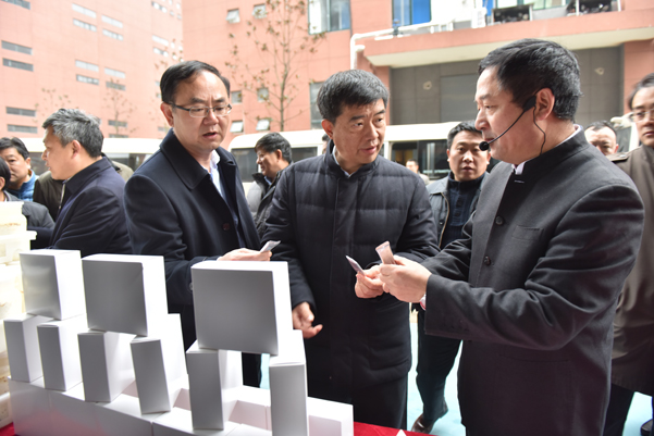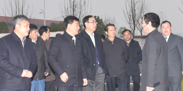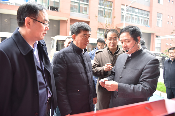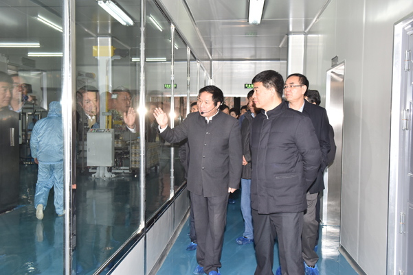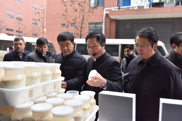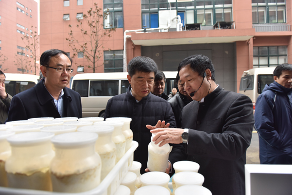 市委書記孫云飛(左三)、市政協主席王勝(左二)、市委常委常務副市長付新安(右一)、金寨縣縣長汪冬(左一)觀看菌瓶